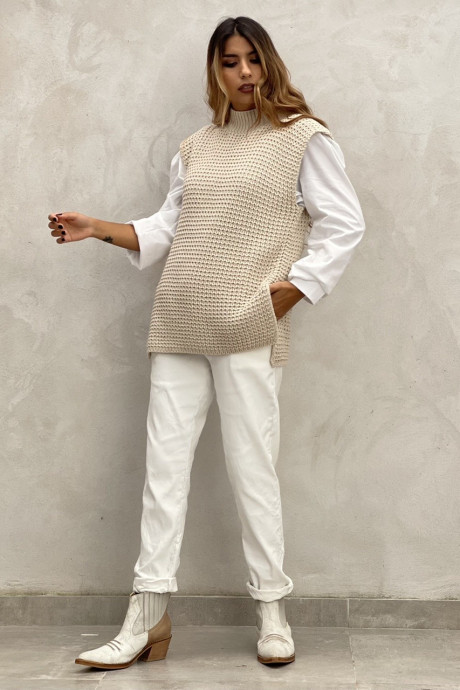 Si bien los flecos le dan un aire jugado, tanto la silueta como el color de este chaleco son bien clásicos. Se puede usar como vestido o con camisa y pantalón abajo, como lo presenta Panthai. Un infaltable de la temporada.