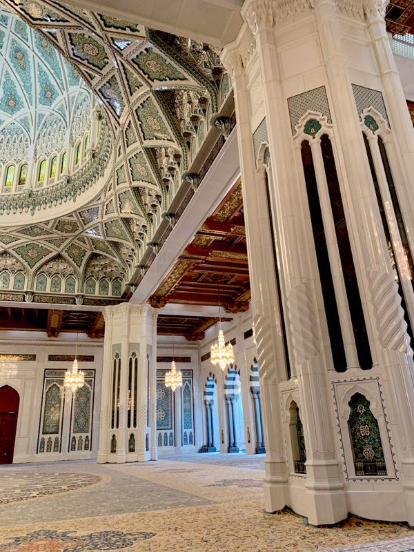 Allí visitamos también el Souq Muttrah, un bazar tradicional tipo mercado de cosas típicas, de gran influencia india, que es ideal para comprar algún que otro sourvenir para traer de regreso a casa. También pasamos por el Royal Opera House, el lugar más importante en Omán para las artes musicales y la cultura, que tiene una arquitectura que es de morirse. Y hablando de arquitectura, un paseo que nos encantó fue el de la Gran Mezquita del Sultán Qaboos, la mezquita más importante del sultanato de Omán; un lugar impresionante que no se pueden perder – aunque hay que planear esta visita con tiempo porque solo se puede ir de 8 a 11 am, y los viernes, día de rezos, cierra al público en general.
