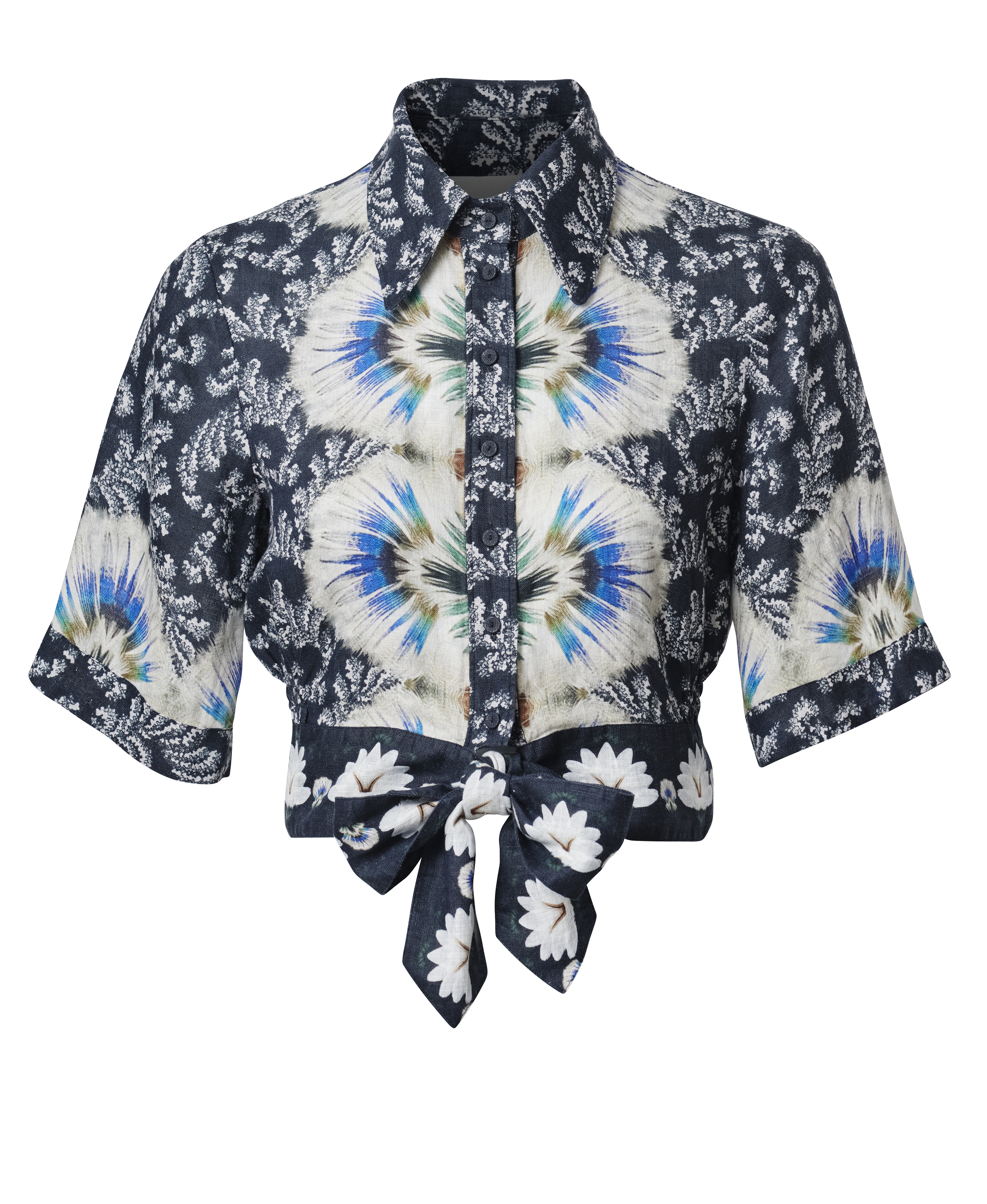 Este crop top camisa anudada al ombligo con estampado psicodélico nos resulta una belleza. Podemos empezar a llevarla con jean, faldas y tanto con un cardigan como con un buen blazer o chaqueta. El estampado vale la inversión por sí solo, porque el tie dye es EL estampado de las próximas temporadas.