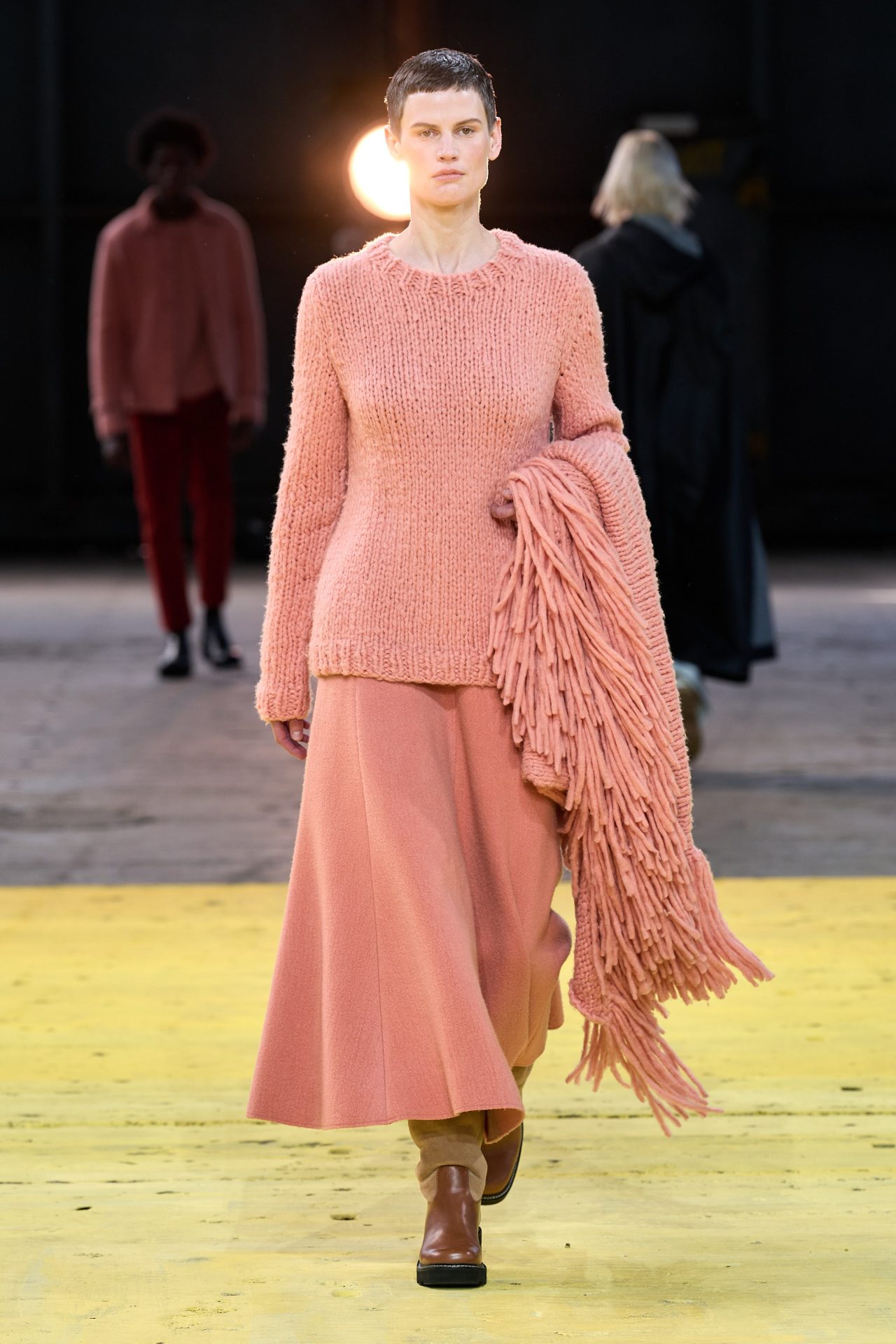 ¿Qué ponerse para trabajar cuando un traje se siente demasiado, pero queres estar con algo ajustado al cuerpo? Una falda y un suéter. Busca inspiración en Gabriela Hearst, el jersey rosa usado con una maxifalda de línea A con paneles en el mismo tono era una forma más acogedora de hacer el doble set. Pulido fácil y fácil.