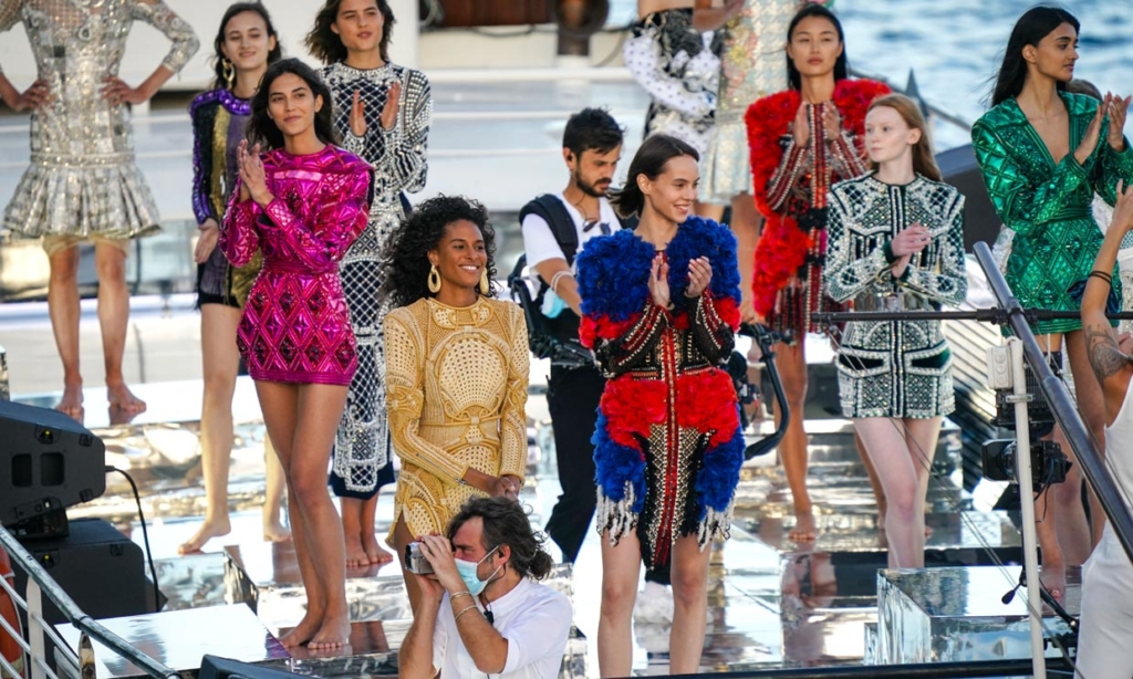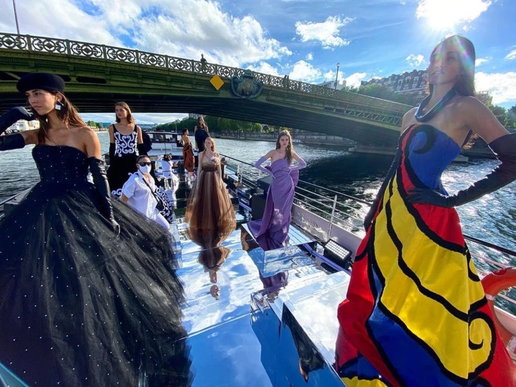 Algo similar hizo Olivier Rousteing en Balmain, el diseñador ya había dicho en Vogue Global Conversations que ni bien se pudiera salir nuevamente a la calle, quería hacer un show para el pueblo francés, en aquel entonces hablaba de una plaza, en la que la gente pudiera asistir de primera mano a su show. Y nos terminó sorprendiendo cuando armó el espectáculo que viajó por los canales de París sobre el techo de un ferry.