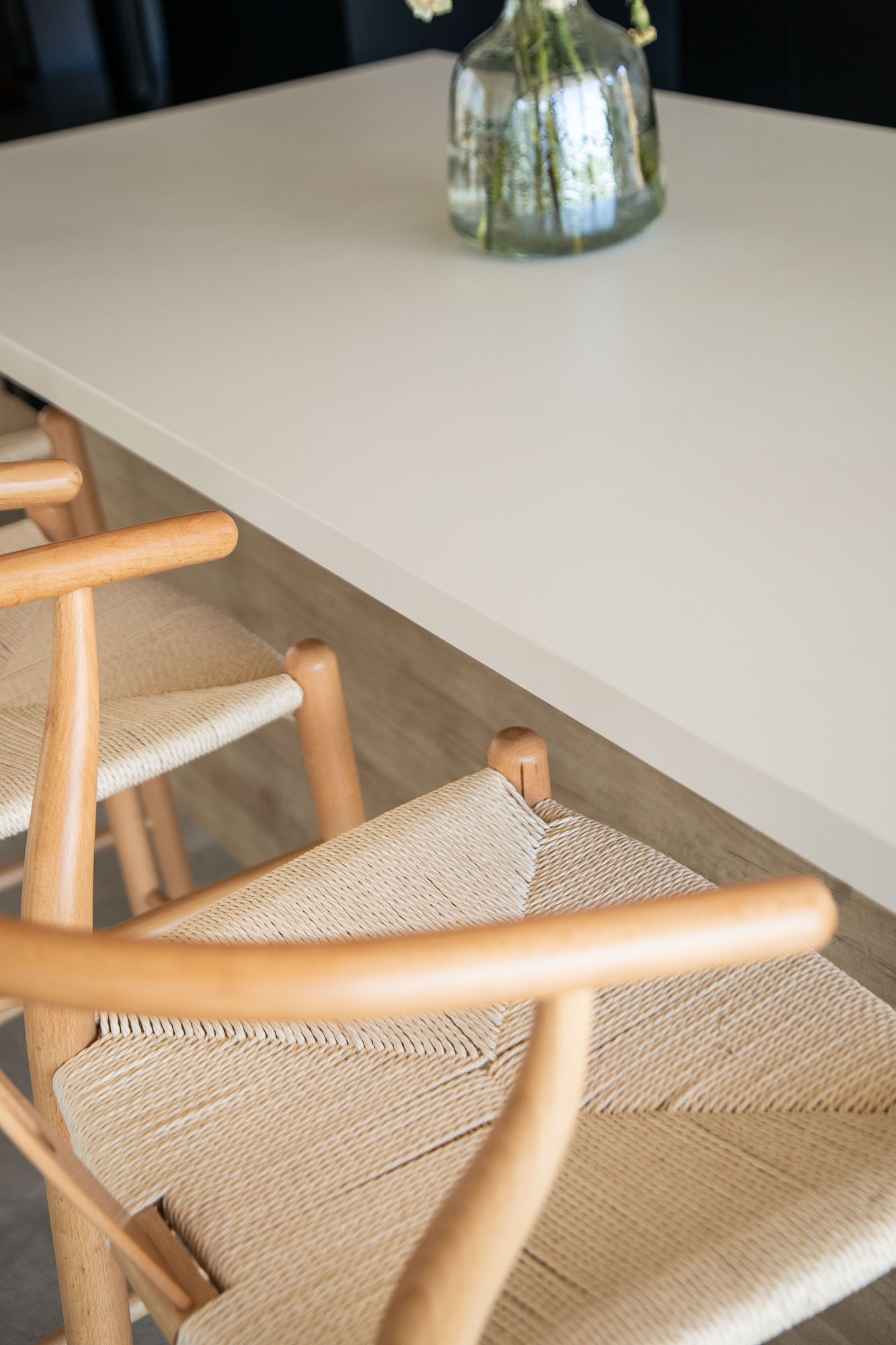 “Para nuestra cocina elegimos revestimientos de tipo subway y bajomesadas y amoblamientos en color oscuro. Trabajamos con DV Mobells el mobiliario y unos genios total!. Lo complementamos con detalles de estantes y banquetas en color madera, para darle calidez y sobriedad al mismo tiempo. Las mesadas las pensamos en conjunto con la marmolería Anibal Abbate y juntos elegimos el Dekton como material para las mesadas de cocina y baños. Lo mejor de este material es el mantenimiento, que para mi fue clave en mis decisiones. Podes cortar, rallar, hasta quemar cualquier material en la mesada que no pasa nada. Además podes apoyar la comida recién salida del horno… ¿que más podemos pedir?“