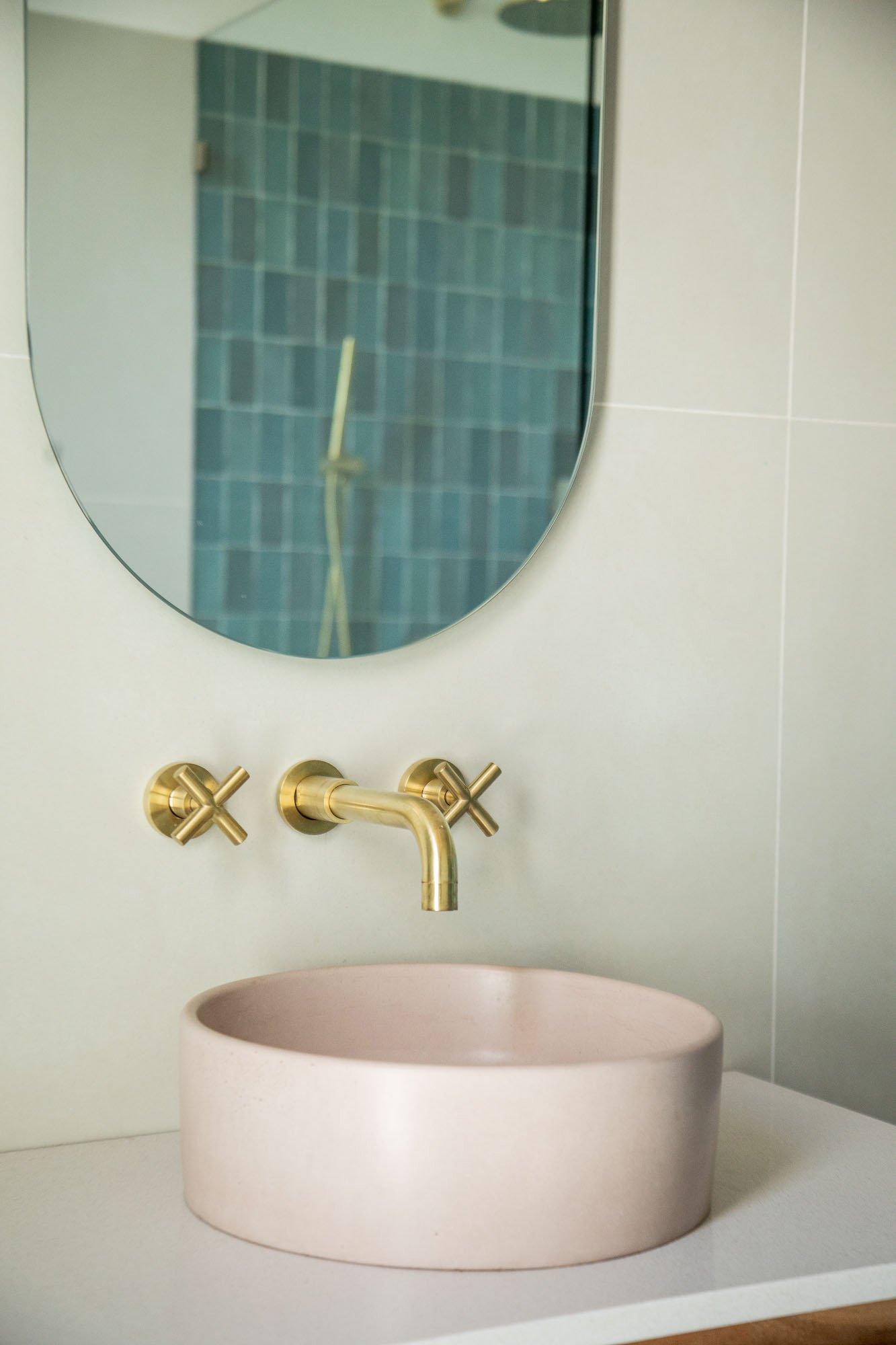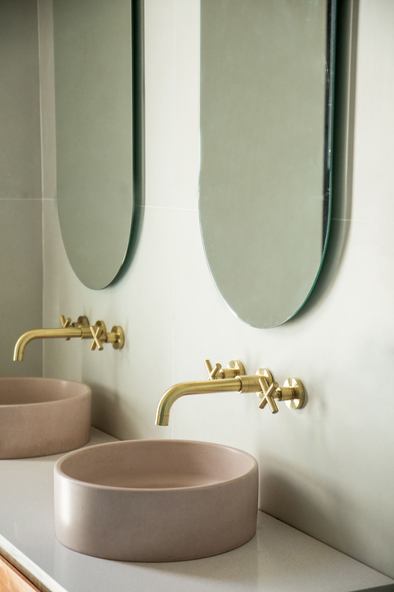 Las bachas de los baños, por su parte, fueron fabricadas por MEZCLA, un grupo de emprendedoras uruguayas que utilizan el concreto como material base para crear objetos decorativos innovadores y modernos.