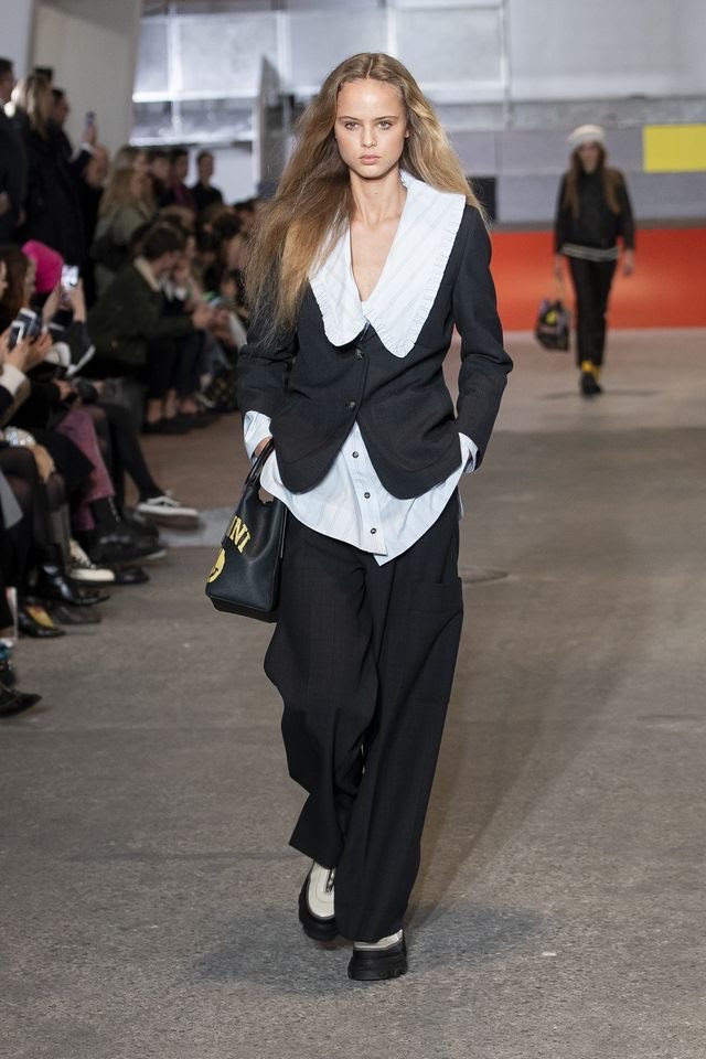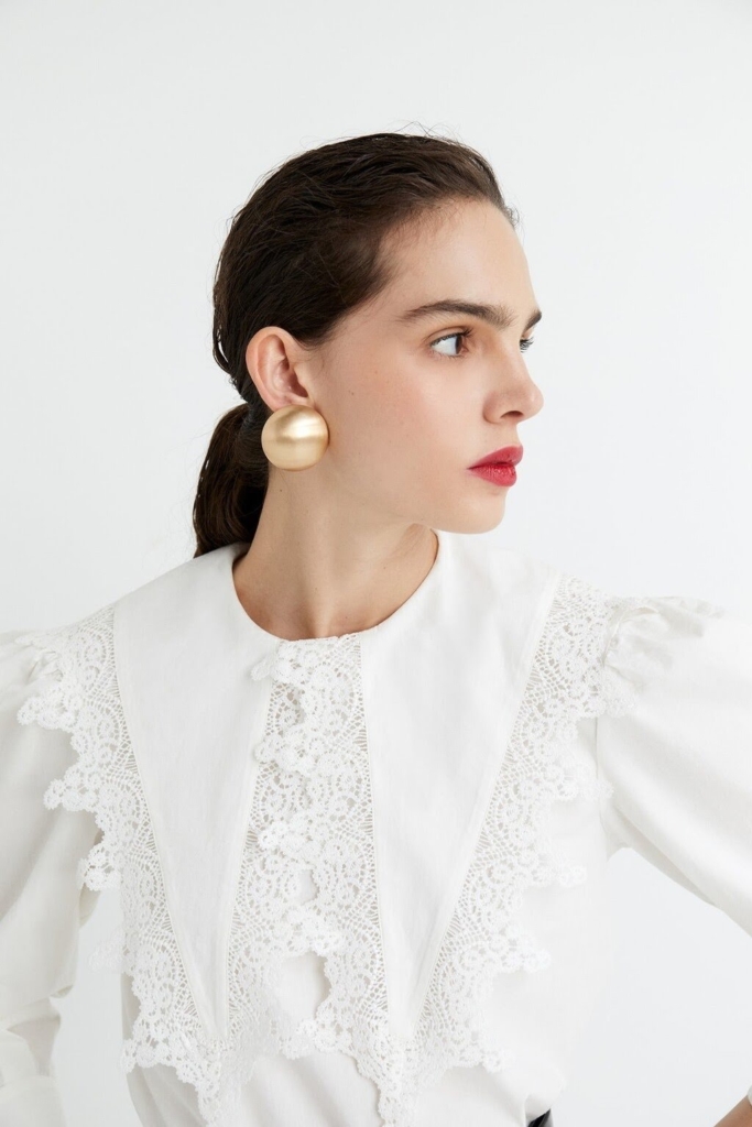 La blusa de cuello llamativo/prominente: los cuellos al estilo Peter Pan extragrandes casi alcanzan proporciones de una pechera, y llegan cargados de bolados o bordado inglés.