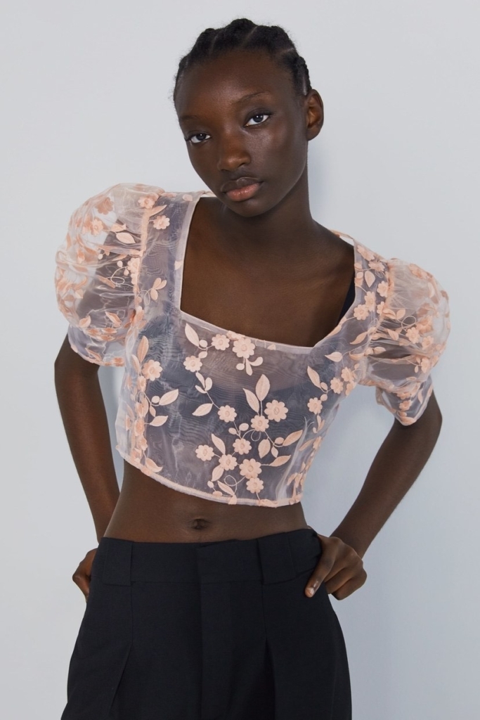 Se puede ver en camisas y blusas de mangas grandes y prominentes, los apliques de perlas, los vestidos con encajes de flores, las faldas midi y más.